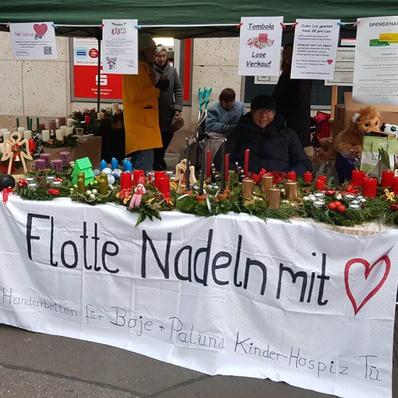 Wir sind eine Gruppe von derzeit ca. 50 Frauen und Männern, die mit kreativen Handarbeiten Spenden sammeln, um die Kinderpalliativarbeit an der Universitätsklinik Tübingen (UKT) "Paluna" sowie den häuslichen Hospizdienst "BOJE" zu unterstützen.
