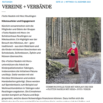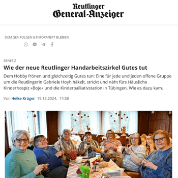 Ein- bis zweimal im Monat treffen sich die „Flotten Nadeln mit Herz" im Schützenhaus Reutlingen und lassen die Nadeln schwingen: Stricknadel, Häkelnadeln, Nähnadeln. Das Ziel von Gründerin Gabi Hoyh: mit dem Erlös der kreativen Produkte möglichst viel Geld für unheilbar kranke Kinder zu sammeln. Genauer gesagt: jeweils zur Hälfte für die Pädiatrisch-palliative Lebensbegleitung und Netzwerkarbeit, kurz PALUNA, der Uniklinik Tübingen sowie den häuslichen Hospizdienst BOJE Tübingen.