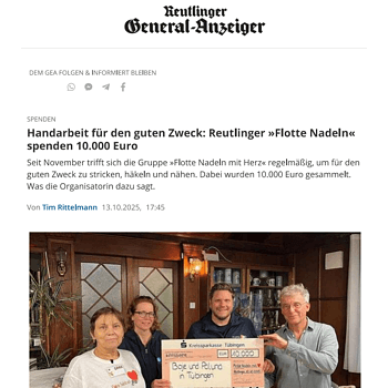 In Reutlingen haben rund 30 Frauen der Gruppe "Die flotten Nadeln mit Herz" 10.000 Euro Spenden gesammelt. Gründerin Gabriele Hoyh hatte die Idee, Strickwaren in Spendenkörben in Geschäften anzubieten. Der Erlös kommt schwerkranken Kindern zugute.